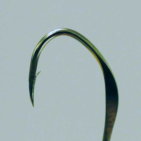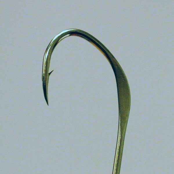 This is a similar hook pattern to the abumi, varing in shape at the bottom of the shank, plus having a section of flattened shank that make it ideal for small soft baits like crab flesh & prawn.the hook point is slightly turned to avoid damage that can occure when fishing over rocks and shingle but has a superb hook hold with a fine barb on the internal angle. The hook allows for fine bait presentation and the needlepoint sharpness is superb on such a lightweight hook.